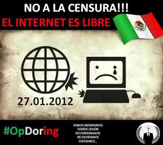 Por eso este Viernes 27 de enero del 2012 a las 11:00 am Anonymous Llevará a cabo la #OpDoring en protesta a esta ley apóyanos en esta Operación no dejes que nos censuren Internet
